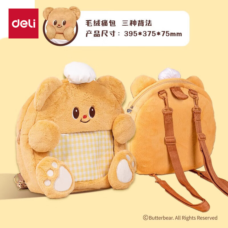 得力黄油小熊便携收纳包儿童背包斜挎包 毛绒-痛层双肩包 HY710