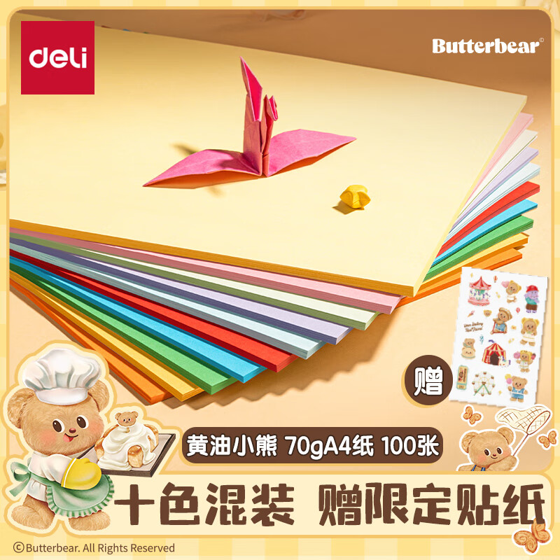 得力HY377黄油小熊彩色复印纸70g-A4-100页/包-1包(混)(包)