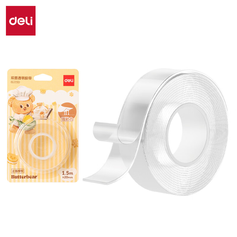 得力HY560黄油小熊系列双面透明胶带1mm*20mm*1.5m(1卷/卡)